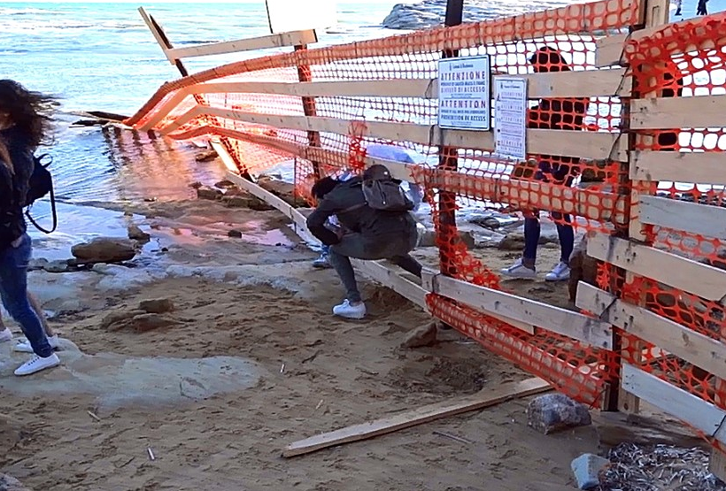 “Da qualche settimana si stanno effettuando i lavori di messa in sicurezza, a seguito dei crolli del dicembre 2017 – afferma Mareamico – e la ditta che sta effettuando i lavori ha realizzato ben due steccati per impedire la visita della famosa parete rocciosa a picco sul mare. Senza i necessari controlli i visitatori hanno sfondato le transenne ed in centinaia – conclude Mareamico – ogni giorno penetrano nell’area mettendo a rischio la propria vita!”