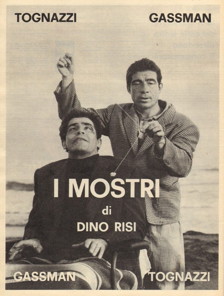 Dino Risi è con ogni probabilità il cantore più profondo, sincero e traumatico del boom economico. I mostri è in tal senso un’operazione perfino teorica, oltre che devastante sotto il profilo strettamente cinematografico: nessuno in seno all’industria nazional-popolare ha mai sposato in modo così estremo i connotati del grottesco, del laido, del viscido. Mai il cinema italiano ha eretto statue a baluardi dell’ignominia come la galleria di personaggi che il film mette in fila, quasi si trattasse di una mostra d’arte contemporanea, un’installazione da padiglione della Biennale. Il ricorso sistemico al micro-metraggio permette di bombardare il pubblico con un campionario di bestialità pressoché infinito: c’è quello che impartisce lezioni di evasione delle leggi al figlioletto – e si troverà ucciso e derubato dal pargolo appena questi crescerà –, il tizio che sfrutta la cecità del fratello, il padre di famiglia numerosissima che scippa di fatto i soldi che servirebbero a comprare il latte per una delle creature con la febbre per andare allo stadio a tifare sguaiatamente la Roma, la presidentessa di un importante premio letterario (palese ironia sullo Strega) che smuove i voti a uso e consumo del libro del ragazzotto illetterato che si sta portando a letto. Solo per fare degli esempi. Dall’alta borghesia alle forze dell’ordine, dal sottoproletariato al piccolo-borghese che compra l’automobile a suon di cambiali solo per poter andare a rimorchiare prostitute, I mostri è un fermo immagine impietoso, che non salva nessuno e non difende aprioristicamente nessuna categoria. I mostri è il film più sadico, lo sberleffo più crudele mai messo in pratica da Dino Risi; nell’Italia placida e grassoccia del boom economico questi venti episodi irrompevano come una bomba a mano, la deflagrazione in grado di mettere a soqquadro il palchetto borghese, e le sue infinite ipocrisie.
