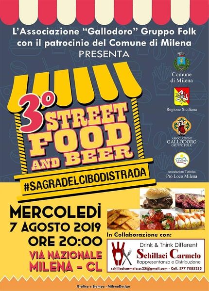 L’Associazione Gallodoro Gruppo Folk e Carmelo Schillaci Drink & think Different col patrocinio del Comune Milena Vi invita a partecipare Mercoledì 7 Agosto 2019 alle ore 20:00 presso la Via Nazionale di Milena al 3° STREET FOOD AND BEER. L’evento “STREET FOOD AND BEER”, interamente dedicato al CIBO DI STRADA, ha lo scopo di coinvolgere tutte le attività locali gastronomiche che cucineranno appunto in strada una varietà di pietanze per allietare il vostro palato; inoltre la birra alla spina accompagnerà ogni piatto scelto da voi, da qui nasce il nome BEER. La serata sarà decorata da tanta buona musica con live band che suoneranno lungo tutto il percorso dello street food, ed altri generi di intrattenimento. L’idea di accoppiare cibo, birra e musica ha lo scopo non solo di incrementare l’economia commerciale del paese ma anche di far sì che l’evento sia alla portata di tutti e crei armonia e tanto divertimento. Ingresso gratuito Posteggio autobus a pochi metri Disponibilità di pernottamento per Info contattare Rosamaria Falcone +39 327 3167255 Carmelo Schillaci +39 377 708 5285.