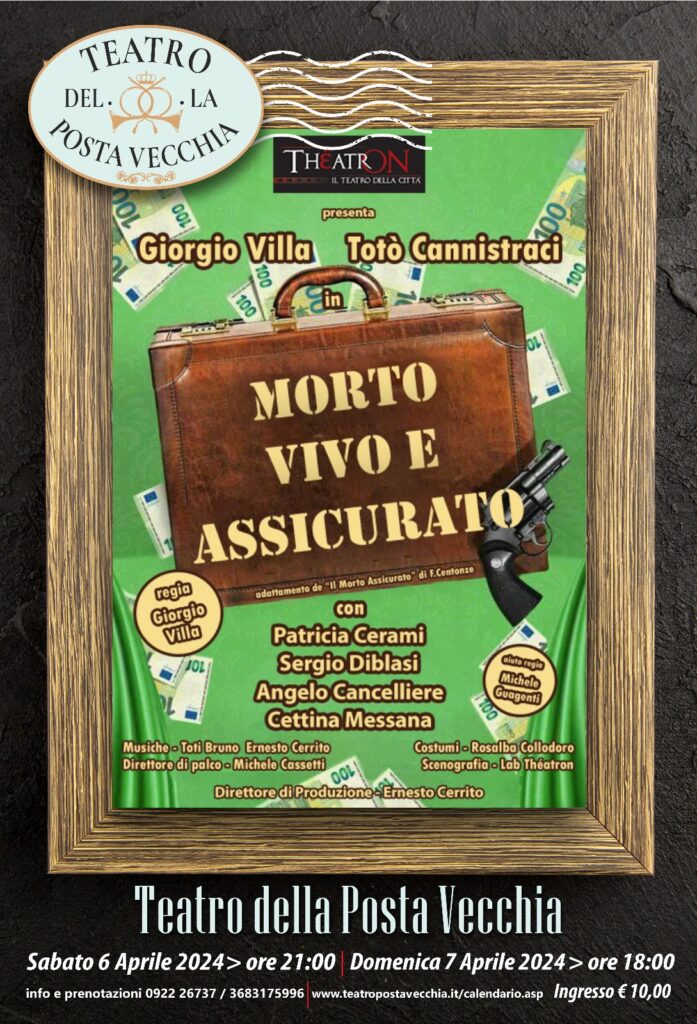 Questo fine settimana al Teatro della Posta Vecchia uno spassosissimo spettacolo di teatro comico. Sabato 6 alle ore 21 e domenica 7 alle ore 18 andrà in scena “Morto vivo e assicurato”, per la regia di Giorgio Villa, con Totò Cannistraci, Giorgio Villa, Patricia Cerami, Sergio Diblasi, Angelo Cancelliere e Cettina Messina. Si tratta di una commedia brillante, in due atti, che ben si inserisce nel vario panorama del cartellone di quest’anno così ricco di lavori teatrali di diverso genere. Una trama esplosiva ed esilarante con colpi di scena e situazioni spassose.