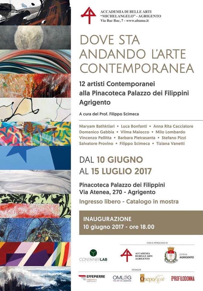 Approda dunque ad Agrigento la mostra itinerante che indaga l’arte contemporanea. In visione opere di 12 artisti: Miryam Bakhtiari, Luca Bonfanti, Anna Rita Cacciatore, Domenico Gabbia, Milo Lombardo, Vilma Maiocco, Vincenzo Pellitta, Barbara Pietrasanta, Stefano Pizzi, Salvatore Provino, Filippo Scimeca, Tiziana Vanetti.