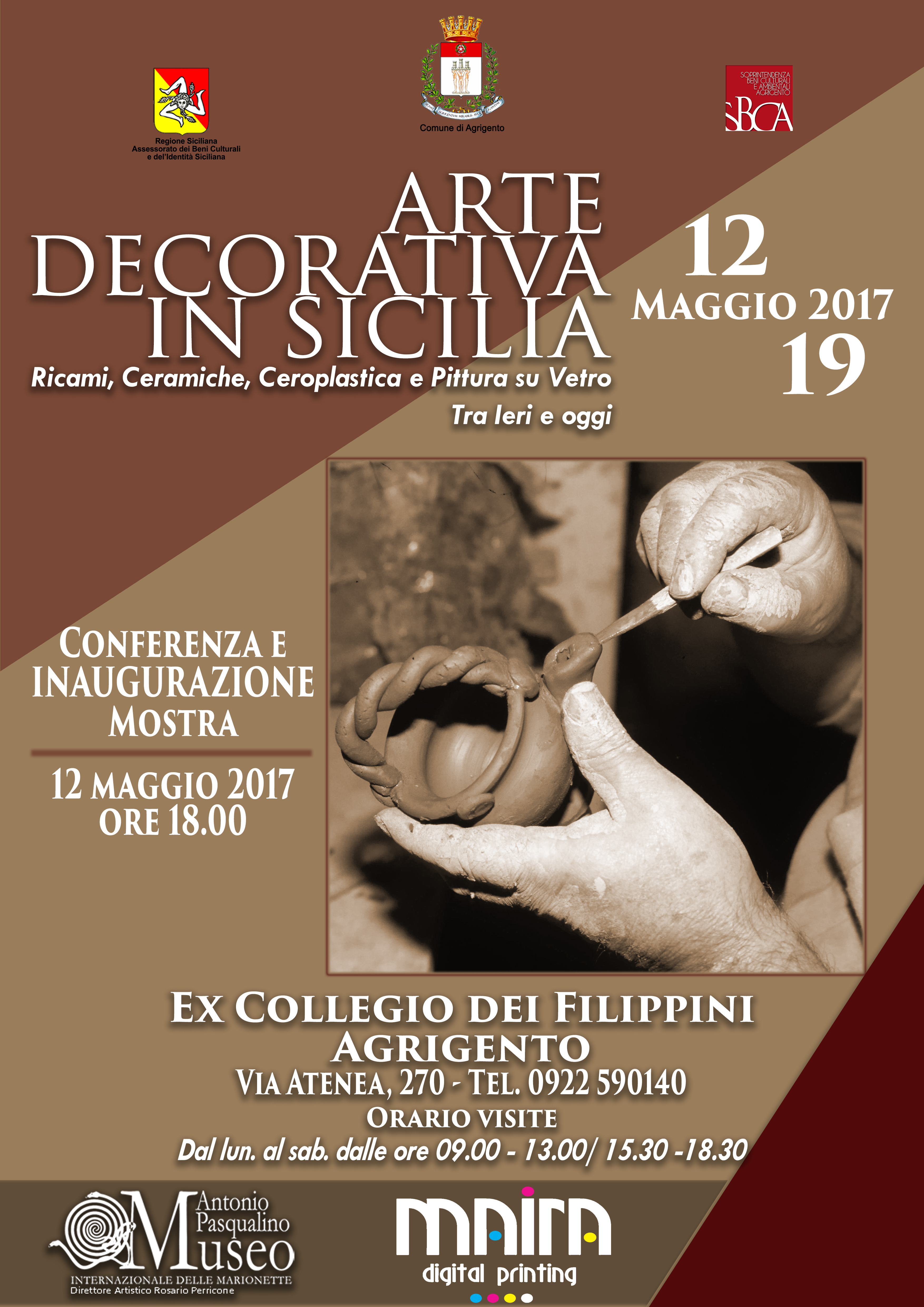 Giorno 12 Maggio alle ore 18.00, verrà inaugurata la Mostra Arte Decorativa in Sicilia. Ricami Ceramiche, Ceroplastica e Pittura su Vetro Tra ieri e oggi, presso i locali dell’Ex Collegio Dei Filippini di Agrigento. La mostra, organizzata e curata dalla storica dell’arte agrigentina Doresita Marino, si avvale del Patrocino gratuito della Soprintendenza di Agrigento e dell’Assessorato dei Beni Culturali della Regione.