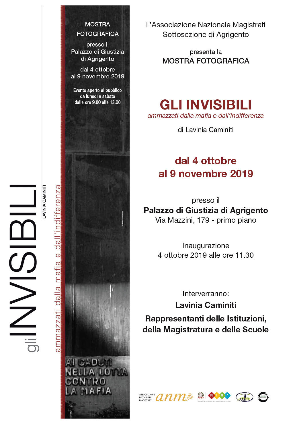 Una interessante mostra, organizzata dall’Associazione nazionale magistrati – Sottosezione di Agrigento, dal titolo “Gli invisibili” di Lavinia Caminiti, sarà ospitata in Tribunale ad Agrigento dal 4 ottobre al 9 novembre p.v. e prevede l’attivazione di incontri bisettimanali con le scolaresche del territorio.