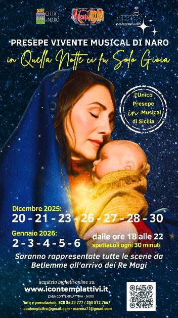 “Il nostro Presepe è un viaggio dentro la meraviglia del Natale – spiega Massimiliano Arena – dove ogni suono, gesto e parola nascono dal desiderio di raccontare la speranza. È un evento che coinvolge l’intera comunità, i giovani, gli artisti e chi ama la bellezza del nostro territorio”. Il Presepe Vivente Musical di Naro è un progetto che nasce per valorizzare i luoghi storici, promuovere il turismo culturale e offrire al pubblico un modo nuovo di vivere il Natale in Sicilia. Un appuntamento ormai atteso che unisce arte, fede e identità locale in una grande celebrazione collettiva.