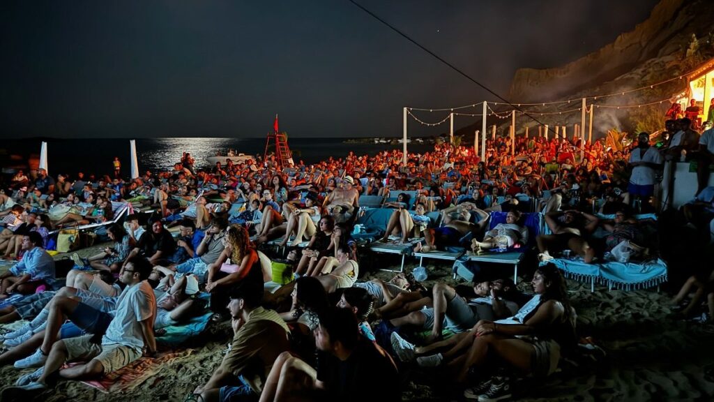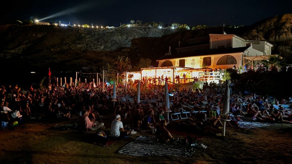 Prima avevano una sola platea, ora ne hanno due, una davanti e una dietro lo schermo. Il Nodo Ammare è diventato un punto di riferimento per il litorale agrigentino, entrato di diritto nella cerchia dei luoghi del “cuore”. Non si distingue solo per la movida, i servizi spiaggia e la ristorazione. Il locale, voluto e curato da Fabio Speranza, ha lanciato un format che molti stanno cercando di imitare, ma che pochi riusciranno a comprendere fino in fondo. Stiamo parlando del CinemaAmmare. “Che dire, quasi 500 persone erano impensabili all’inizio. Ogni volta diventa sempre più bello e si ripropone quell’atmosfera magica di un’estate che vorremmo non finisse mai”. Il direttore artistico e ideatore del format, Marco Gallo, non sta più nella pelle. Il suo commento è la sintesi di tanti sforzi e sacrifici, ma soprattutto del credere in un progetto. La gente si diverte anche con una proiezione sullo schermo: film vintage, fiabe e titoli più attuali. La scelta del film cambia poco, poiché Marco e Fabio lasciano decidere al pubblico preventivamente attraverso un sondaggio sui canali Instagram. Il cinema sulle sdraio funziona e attira ogni fascia di età. Poi ci sono le grigliate in spiaggia e perfino il bagno in notturna. Davvero magico, come dice Marco. “Non solo il CinemaAmmare“, ricorda Fabio, “ma anche il Nodo Rose: siamo nel clou della stagione e già possiamo ritenerci soddisfatti, perché il pubblico arriva, va via felice, poi ritorna e porta altre persone”. Speranza cura ogni dettaglio e perfino la scelta della materia prima non è casuale. Così lo street food in spiaggia e le sdraio, che la gente occupa già dal mattino, sono diventati un fenomeno di richiamo. E come tutte le cose che diventano virali e di tendenza, è arrivata anche la vignetta. Sergio Criminisi ha dedicato all’evento uno dei suoi capolavori, rappresentando Fabio e Marco insieme in una meravigliosa vignetta che racchiude in sintesi il “CinemaAmmare”.