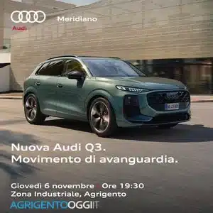 Giovedì 6 novembre alle 19:30 la sede Audi Meridiano di Agrigento, nella Zona Industriale, apre le porte alla nuova protagonista della mobilità contemporanea: la Nuova Audi Q3. Avanguardia è la capacità di leggere il presente e trasformarlo in movimento verso il futuro. Ed è da questa visione che nasce la nuova Q3: un’auto che interpreta il cambiamento con il carattere deciso del suo design scolpito, l’intelligenza della tecnologia e lo spirito urbano di chi guarda sempre oltre. Dal palcoscenico digitale all’assistente vocale evoluto, passando per una gamma di sistemi di assistenza alla guida e il Trained Parking con autoapprendimento delle manovre, la nuova Q3 porta l’innovazione nei tragitti di ogni giorno. Un appuntamento per scoprire, da vicino, il movimento dell’avanguardia Audi. Per partecipare all’evento è necessario confermare la propria presenza compilando il modulo di adesione disponibile presso Audi Meridiano.