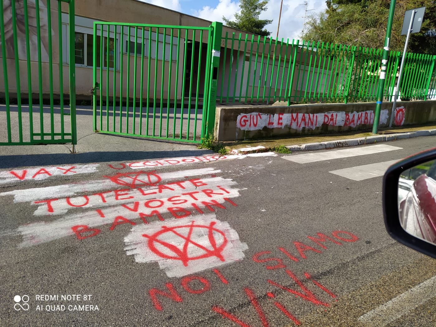 Nuove scritte “no vax” ad Agrigento. Questa mattina sono nuovamente comparse davanti la scuola “Anna Frank”, e al plesso “Carpi”, la sede distaccata che ospita le classi primarie, nella zona del Quadrivio Spinasanta. Le frasi e i simboli utilizzati sono sempre gli stessi: “Il vax uccide”; “No al razzismo sanitario”; “Tutelate i vostri bambini”.