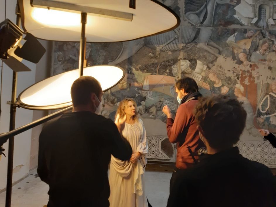 In programma su www.associazionemeno.org da questa sera, venerdì 18, a domenica 20 dicembre alle 21, il cortometraggio si sviluppa attorno al “Trionfo della Morte”, opera unica nel genere per composizione e ricchezza figurativa, immaginando di riportarne in vita i personaggi attraverso una trama visionaria che azzera il tempo che separa quell’affresco dalla contemporaneità, per guardare all’uomo e al mistero della vita. Savatteri si chiede: “Se invece di vedere noi l’opera, fosse l’opera a vedere noi?”. In questa totale scomposizione e deformazione della realtà, l’unico personaggio legato al presente è una donna delle pulizie, interpretata dalla grande Iaia Forte che, suo malgrado, si trova ad essere l’unica visitatrice del museo chiuso per la pandemia nell’anno 2020. Ad impersonare le figure dell’affresco, ricalcandone abiti e movenze, sono invece 12 attori della Casa del Musical. Per l’autore, compositore e regista agrigentino Marco Savatteri, un’altra prova importante dopo la tournée di questa estate con lo spettacolo “Al Passo coi Templi” che ha registrato il tutto esaurito ad ogni tappa e di cui è stato appena tratto il singolo “Il Fato” (℗Incipit Records – gruppo Egea Music, 2020), interpretato da Antonella Anastasi e scaricabile da Spotify e da tutte le piattaforme digitali (https://backl.ink/143620956).