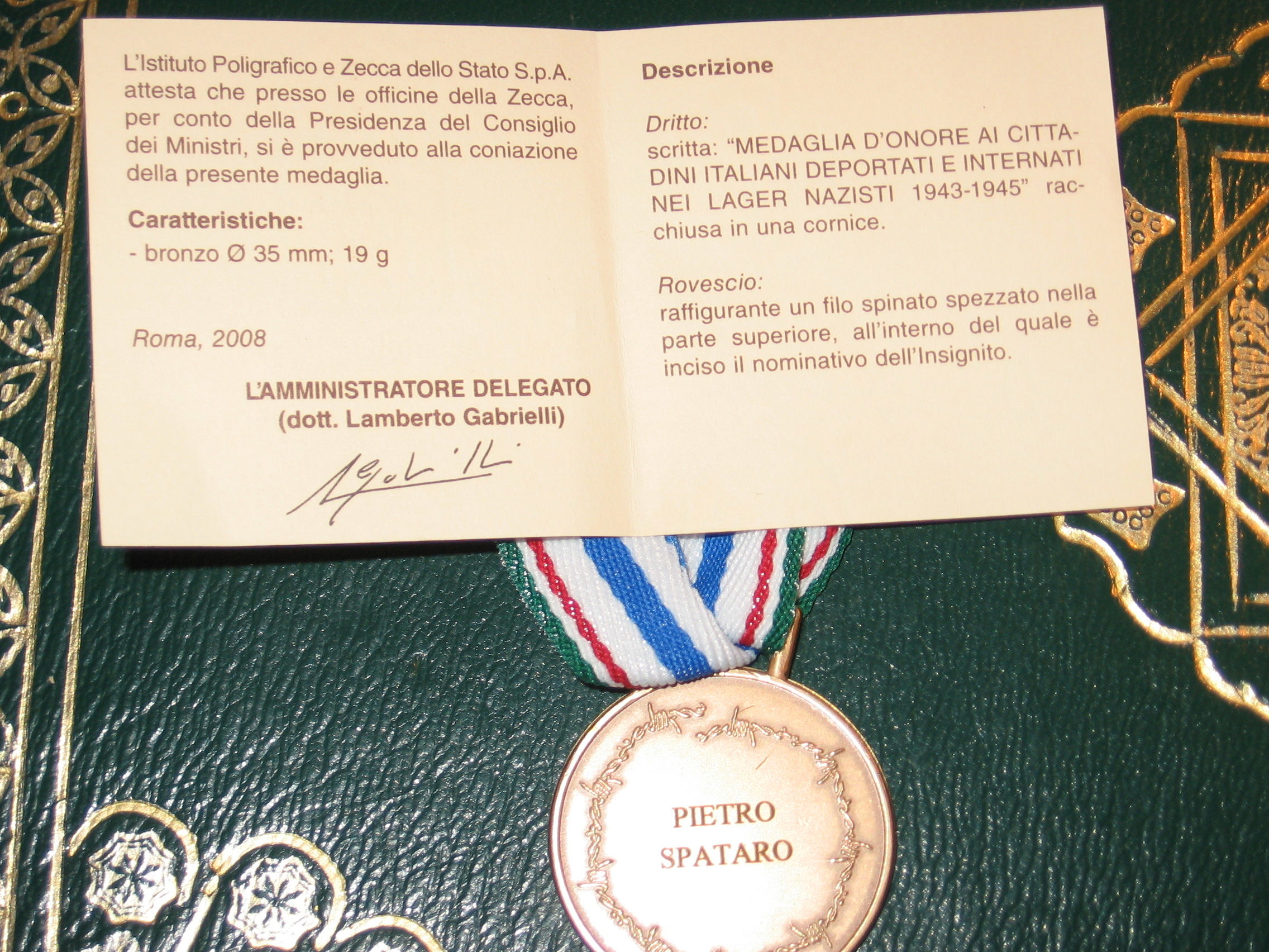 Ai gloriosi caduti della Resistenza italiana ed europea e ai circa 600 mila soldati italiani che, dopo l’8 settembre 43, rifiutarono di combattere negli eserciti nazifascisti e per questo furono uccisi barbaramente (Cefalonia), arrestati e deportati nei campi di lavoro in Germania, in condizione di schiavitù. Fra questi militari, permettetemi di ricordare mio padre, Pietro Spataro (vedi foto d’epoca), che ritornò dal campo di concentramento tedesco nell’agosto del 1945. Solo dopo morto, gli fu conferita una Medaglia d’onore dal Presidente della Repubblica italiana. Ne andiamo orgogliosi!