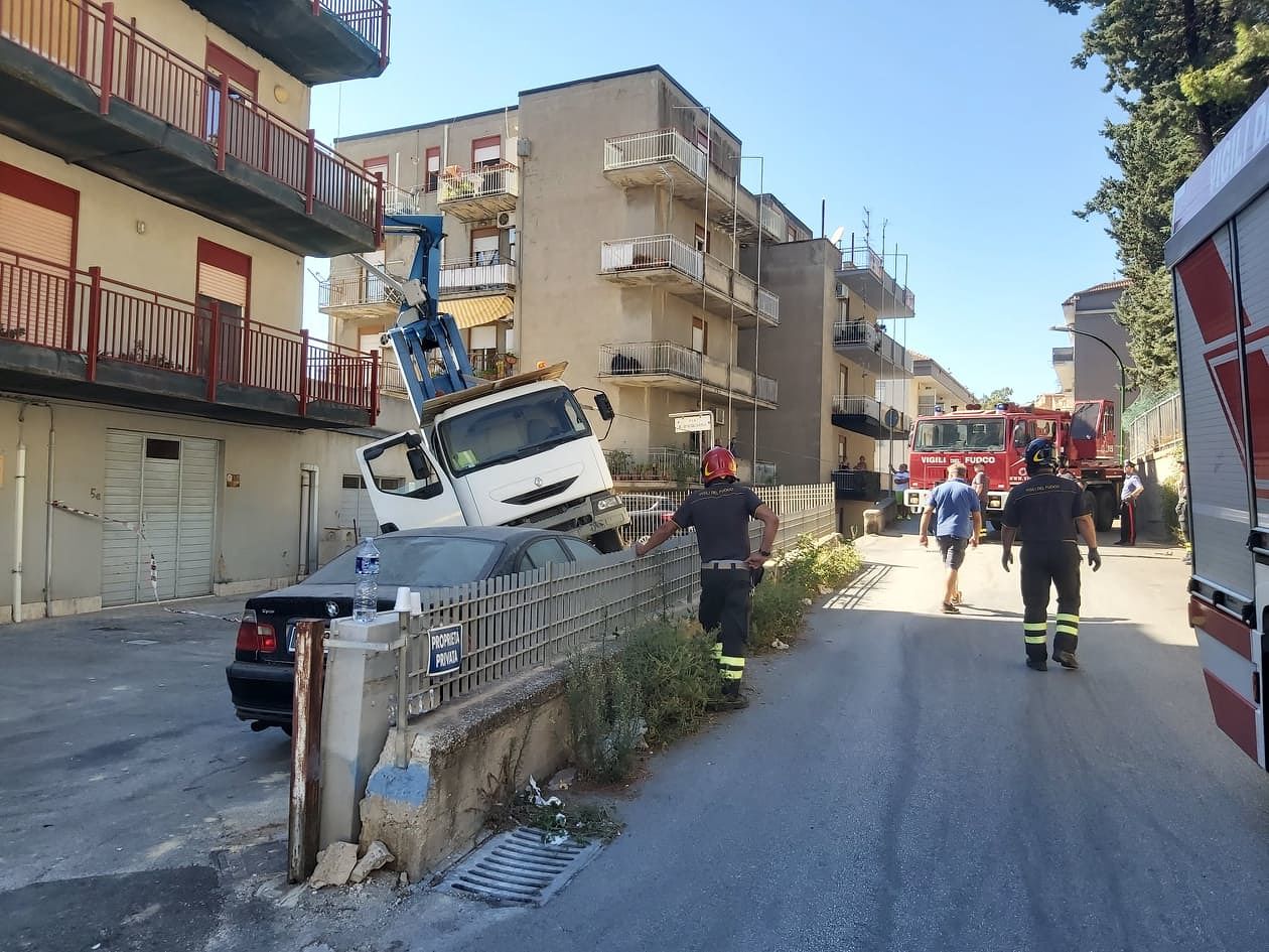 L’asfalto, forse per l’eccessivo peso del camion, ha ceduto e la parte posteriore destra del mezzo è sprofondata in una piccola voragine apertasi sul manto stradale. Questo ha fatto inclinare il veicolo e, il 50enne è caduto nel vuoto.