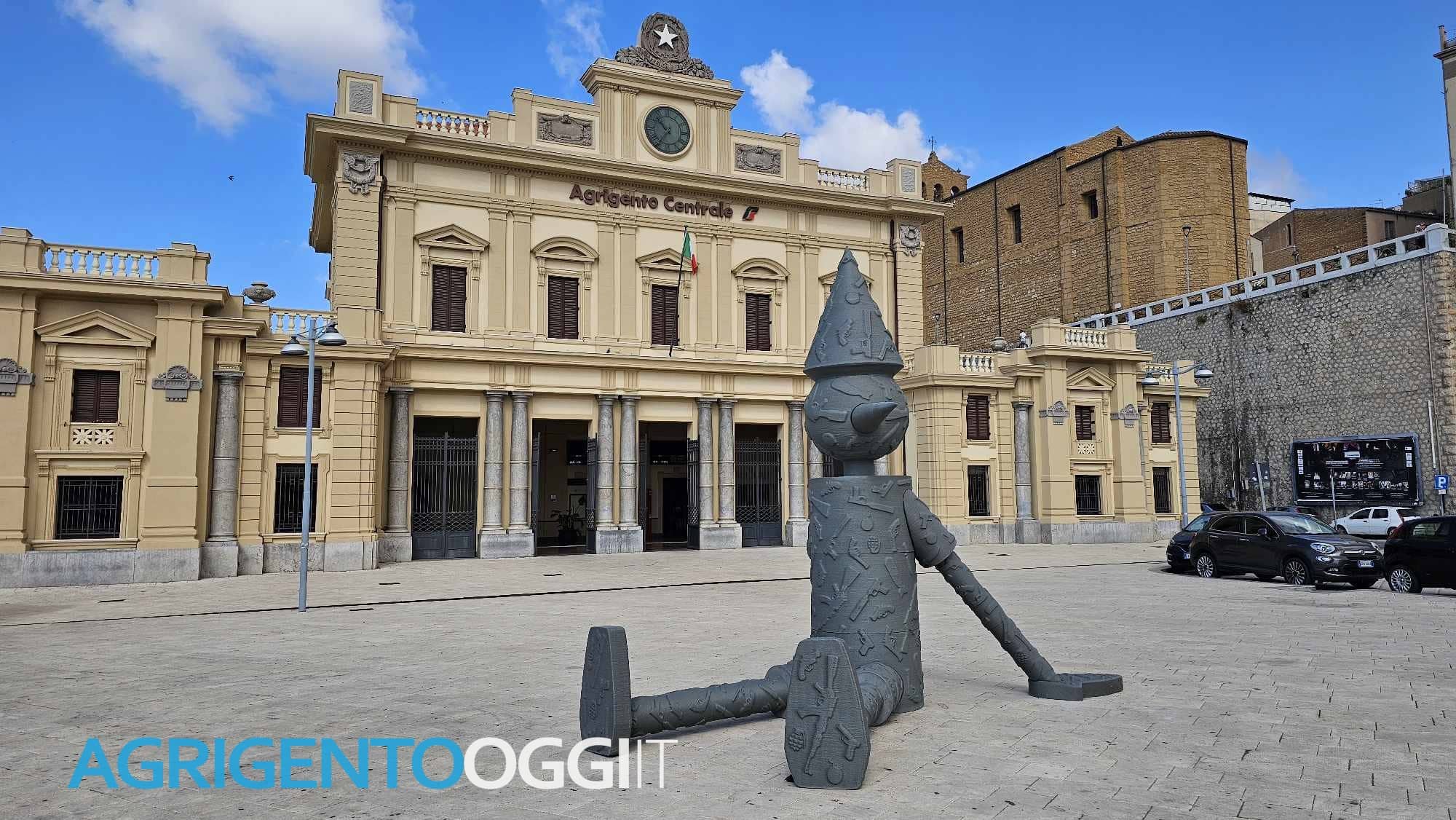 Un’opera raffigurante Pinocchio, alta cinque metri seduto a terra con le gambe distese, è stata collocata in piazza Marconi davanti alla stazione di Agrigento. La struttura, realizzata dall’artista Edoardo Malagigi con plastica riciclata da tetrapak e stampata in 3D, rappresenta un burattino stanco, segnato da tatuaggi di armi, pensato contro la guerra e il commercio bellico.