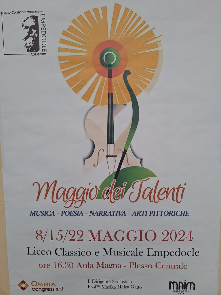 Parte mercoledi 8 maggio alle 16.30 nell’ Aula Magna del Liceo Classico e Musicale Empedocle, la prima edizione di “Maggio dei Talenti”. La manifestazione che proseguirà anche nei due mercoledì succesivi 15 e 22 maggio promuove i talenti nelle arti, nella musica, nella poesia, nella narrativa e nelle arti pittoriche.