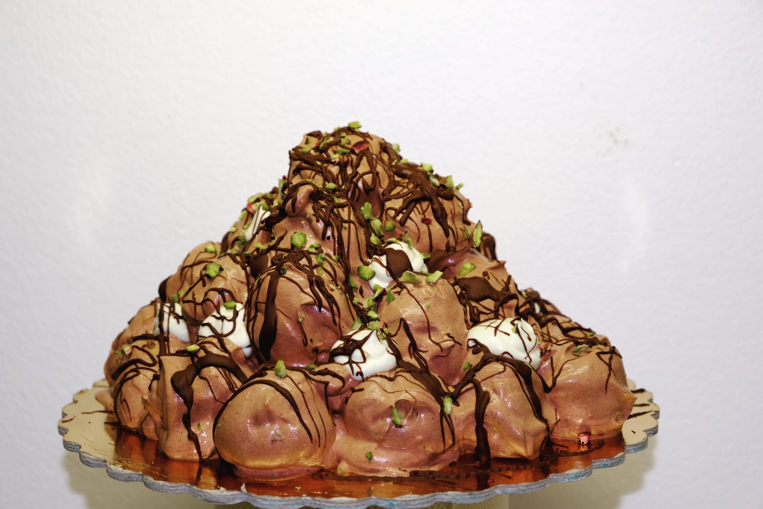 Passarli nella crema al cioccolato e comporre il profitterol.