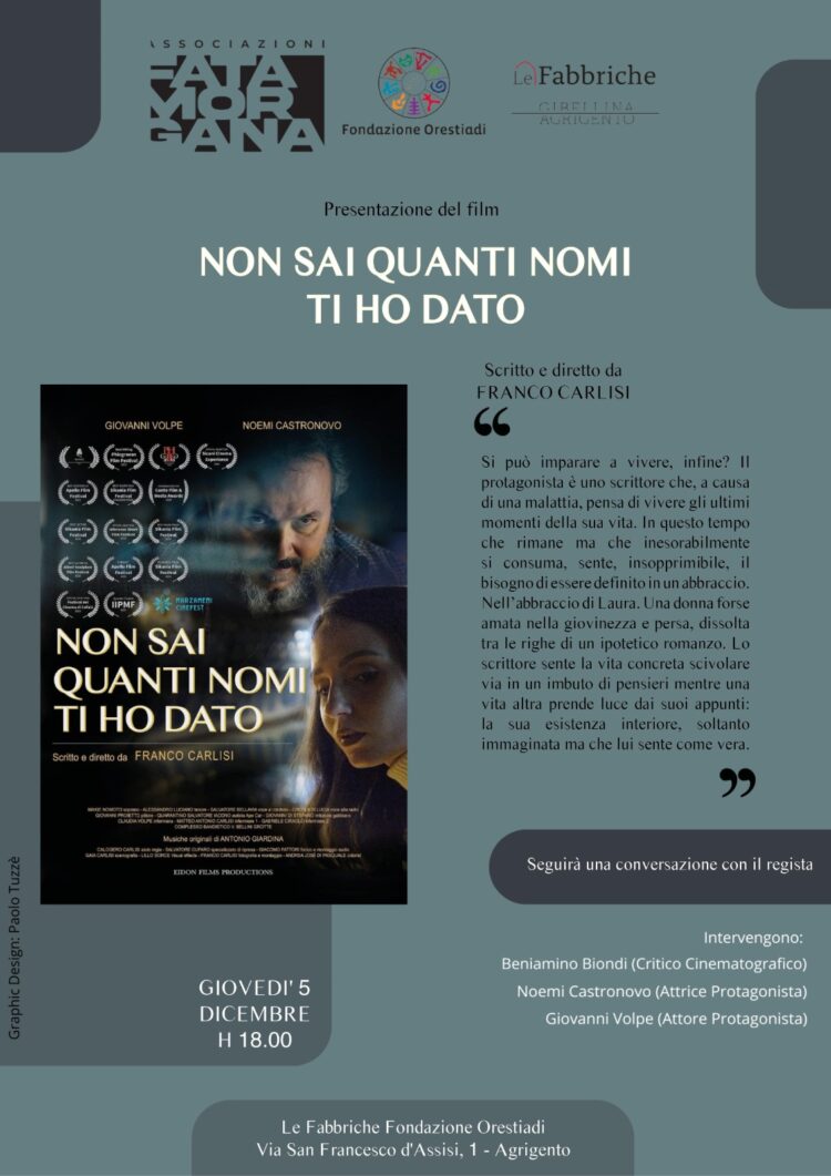 Domani, giovedì 5 dicembre alle ore 18:00, a Le Fabbriche (Fondazione Orestiadi) di Agrigento, proiezione del cortometraggio “Non sai quanti nomi ti ho dato”, il film scritto e diretto da Franco Carlisi che ha già ricevuto importanti riconoscimenti a livello nazionale in diversi festival, e a seguire una conversazione con il regista insieme al critico cinematografico Beniamino Biondi e agli attori protagonisti della pellicola, Giovanni Vole e Noemi Castronovo.