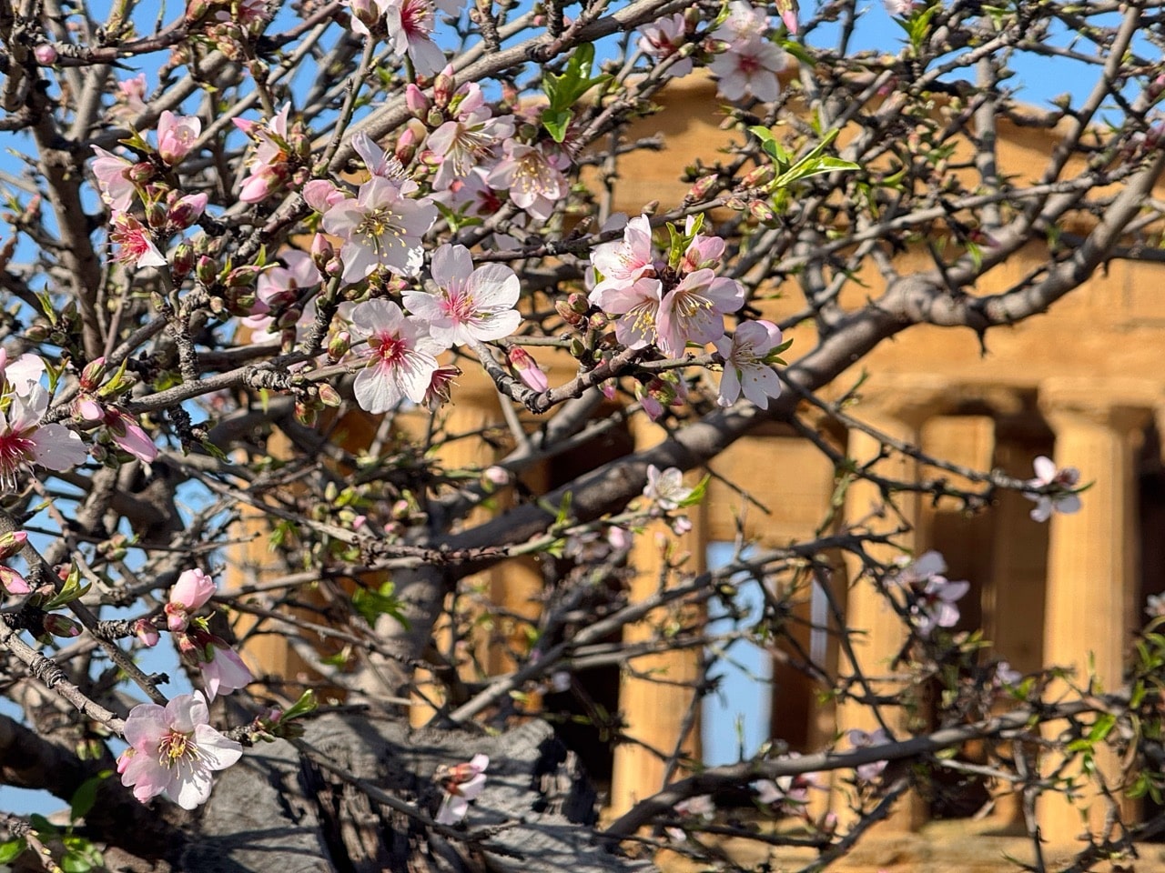 Vedere i mandorli fioriti tra le colonne doriche riporta inevitabilmente al mito di Proserpina. Secondo l’antica leggenda, il ritorno della figlia di Cerere sulla terra segna il risveglio della vita. Anche se il calendario dice febbraio, questo candore sembra sussurrare che Proserpina stia già risalendo dagli inferi, portando con sé la promessa di una nuova primavera e la rinascita di una terra che non si arrende mai.
