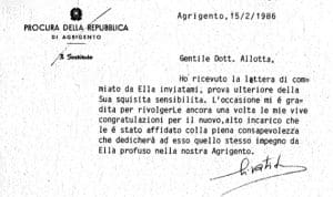 Poi nel 1986, quando il Ministero delle Finanze destinò l‘Intendente di Agrigento all’importante sede di Palermo, il giudice Livatino, nel rispondere ad un biglietto di commiato del dottor Allotta, volle esprimere la consapevolezza che il suo ex direttore sicuramente avrebbe dedicato al nuovo alto incarico palermitano,“quello stesso impegno profuso nella nostra Agrigento”.