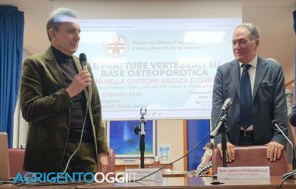 Organizzato dal consigliere dell’Ordine, Carmelo Graceffa, con la responsabilità scientifica di Luigi Basile e Giovanni Cinquemani e con la collaborazione dell’Omceo di Caltanissetta, il seminario si è posto l’obiettivo di “favorire – spiega Santo Pitruzzella, presidente Omceo Agrigento – un approccio multidisciplinare che migliori la prognosi e mitighi l’impatto di questa patologia nella popolazione senile. Ecco perché sono presenti i medici di Medicina generale che fanno la prima diagnosi, i radiologi per la conferma della diagnosi, gli ortopedici e i neurochirurghi per il trattamento, i fisiatri per la riabilitazione e la prevenzione. Le fratture vertebrali osteoporotiche costituiscono una delle più insidiose manifestazioni dell’osteoporosi con una incidenza in allarmante crescita correlata all’invecchiamento demografico globale”.