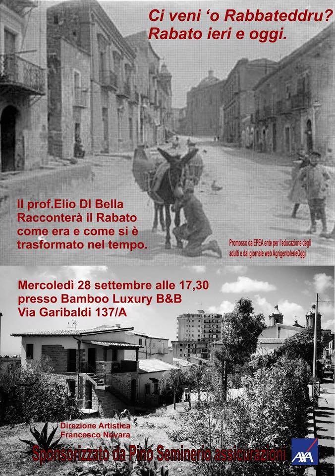 Mercoledì 28 settembre alle ore 18.30, nel cuore del centro storico, al Bamboo Luxury Bed and Breakfast di via Garibaldi 137, il prof. Elio Di Bella, il direttore responsabile del sito web Agrigento Ieri e Oggi, racconterà la storia del Rabato e le sue evoluzioni, in un dibattito aperto a tutti coloro che vorranno intervenire. L’evento, promosso da Bamboo Luxury Bed and Brekfast, da EPEA (ente per la formazione degli adulti) e dal sito web Agrigento Ieri e Oggi, ha la direzione artistica di Francesco Novara . Ingresso libero e gratuito.