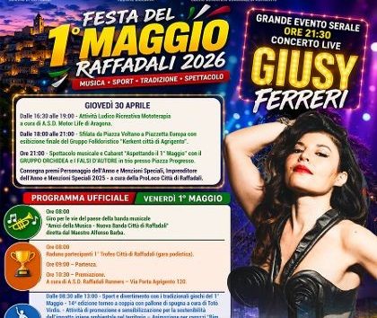 Durante la serata si terrà anche la consegna dei premi “Personaggio dell’Anno” e “Imprenditore dell’Anno 2025”, a cura della Pro Loco di Raffadali. Venerdì 1° maggio la giornata si aprirà con il tradizionale giro della banda musicale “Amici della Musica – Nuova Banda Città di Raffadali”, diretta dal Maestro Alfonso Barba. A seguire, spazio allo sport con il 1° Trofeo Città di Raffadali, gara podistica organizzata dall’Asd Raffadali Runners, e numerose attività dedicate a grandi e piccoli, tra cui giochi tradizionali, tornei e animazione.