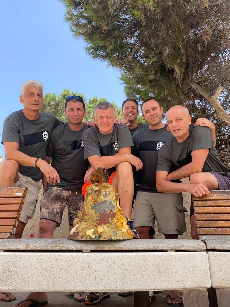La campana, finemente lavorata in bronzo, ha un diametro di 30 cm, un peso di circa 25 kg e riporta a sbalzo il nome della nave, un fascio littorio e altre decorazioni. Al momento del recupero si presentava caduta dal suo supporto e poggiata sull’argano di prua, mentre la chiesuola della bussola, abbattuta sul fondo, era ricoperta da una rete da pesca a strascico del peso di alcuni quintali che i sub hanno rimosso. Entrambi gli oggetti erano stati individuati già nel 2020 durante le operazioni di ispezione e documentazione del relitto, svolte dai volontari della SDSS che ne hanno documentato anche lo stato.