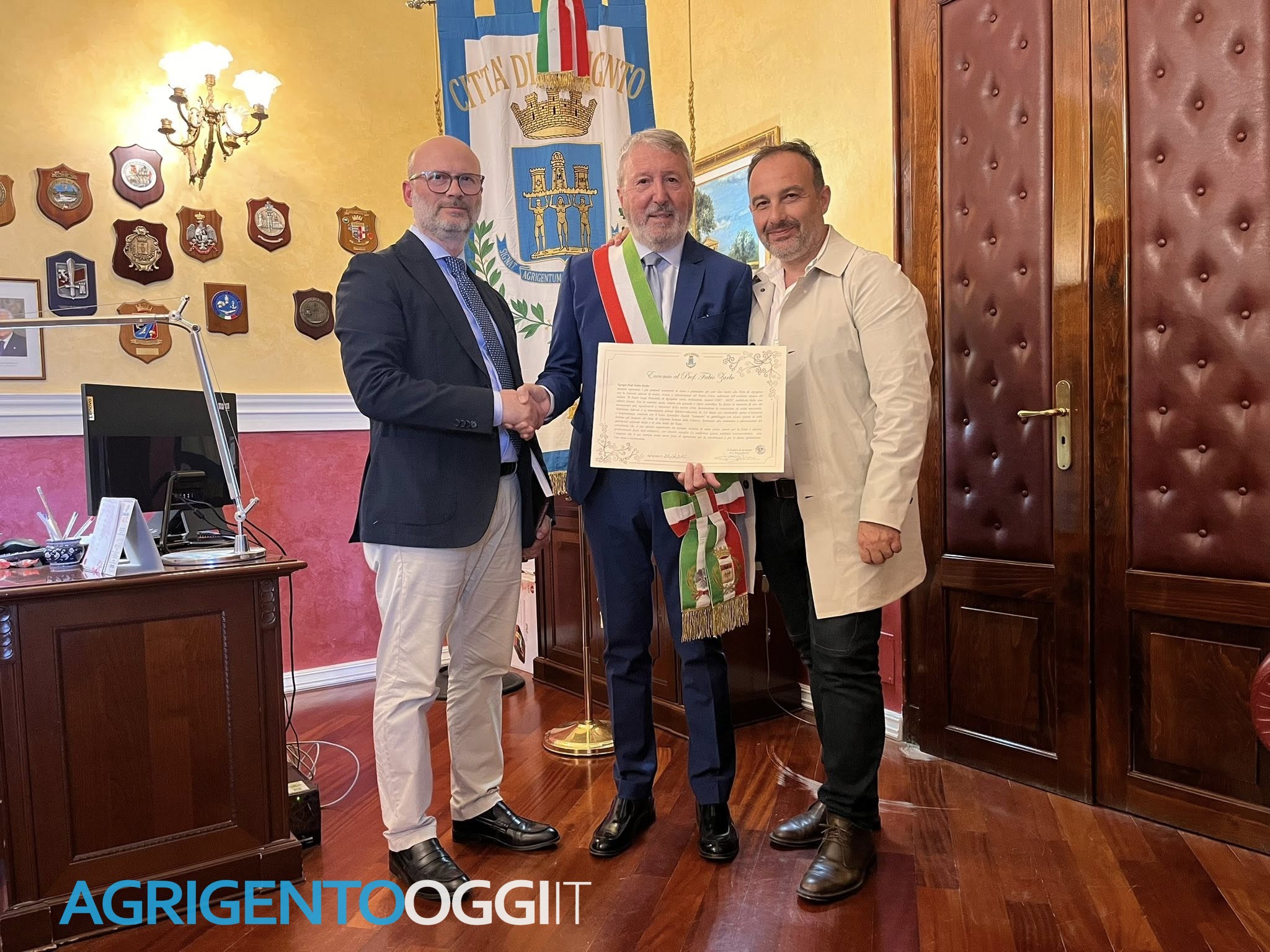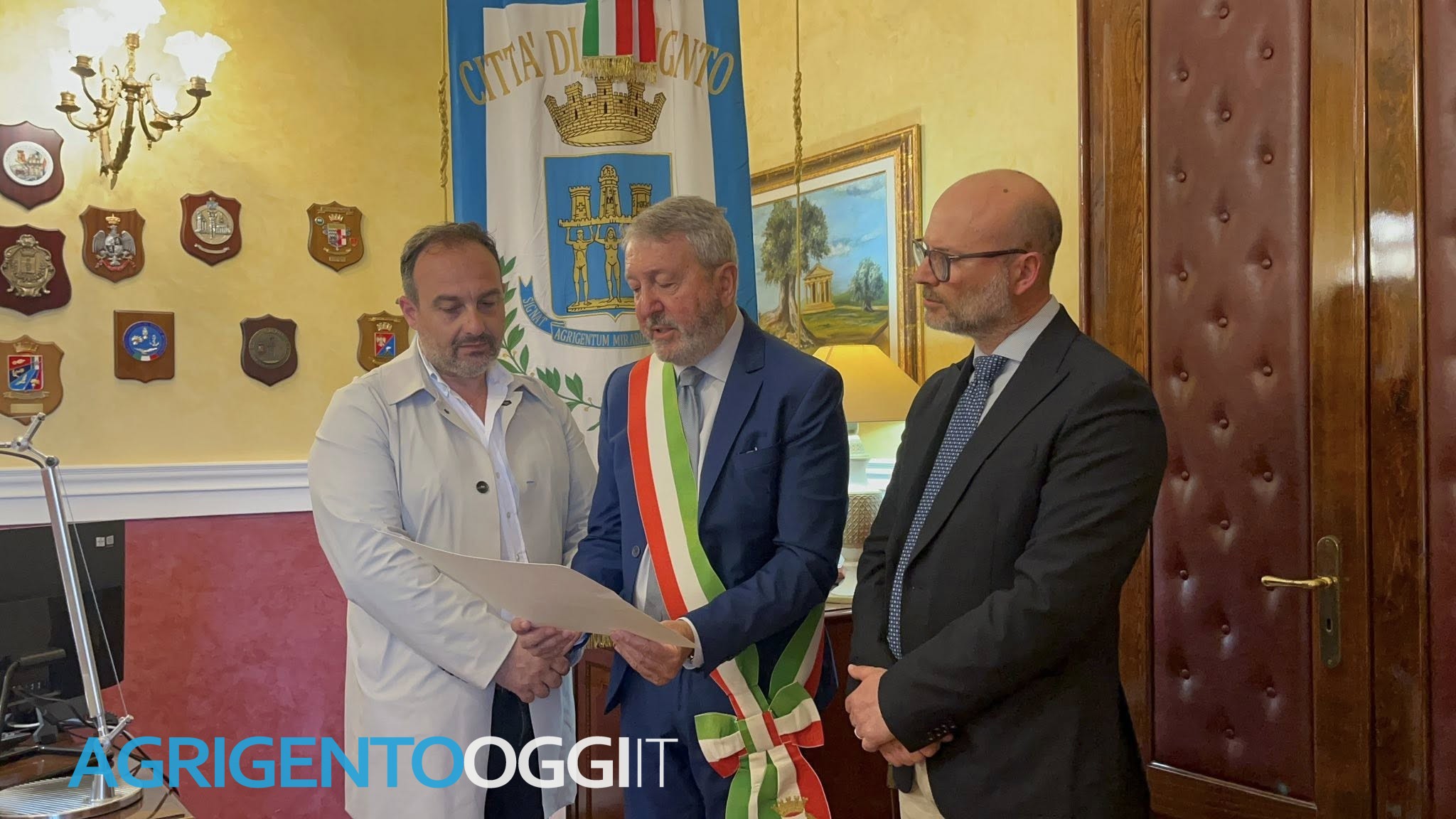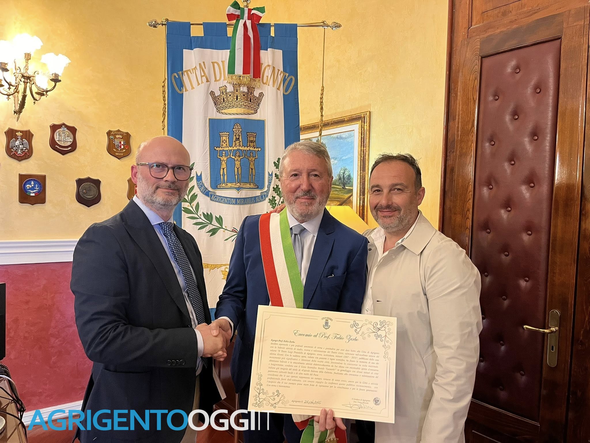 Al Comune di Agrigento il sindaco Francesco Miccichè, insieme al consigliere comunale Simone Gramaglia, ha conferito un attestato di encomio al professor Fabio Zarbo. Si tratta di un prestigioso riconoscimento dell’impegno professionale e culturale profuso con dedizione verso la città di Agrigento, nell’ambito delle attività di architetto e docente, volte alla valorizzazione e alla promozione del patrimonio culturale locale nel panorama nazionale.