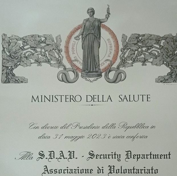 Riconoscimento per la S.D.A.V, Security Department Associazione di Volontariato di Agrigento, da parte del Ministero della Salute: con Decreto del Presidente della Repubblica è stata conferita la Benemerenza al Merito della Sanità Pubblica. “Per il costante impegno profuso durante il periodo di pandemia”, questa la motivazione che ha portato al riconoscimento nei confronti dell’associazione agrigentina che opera dal 2017.
