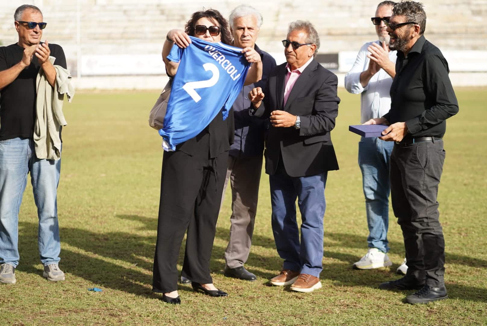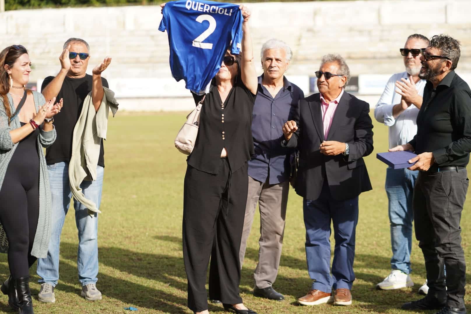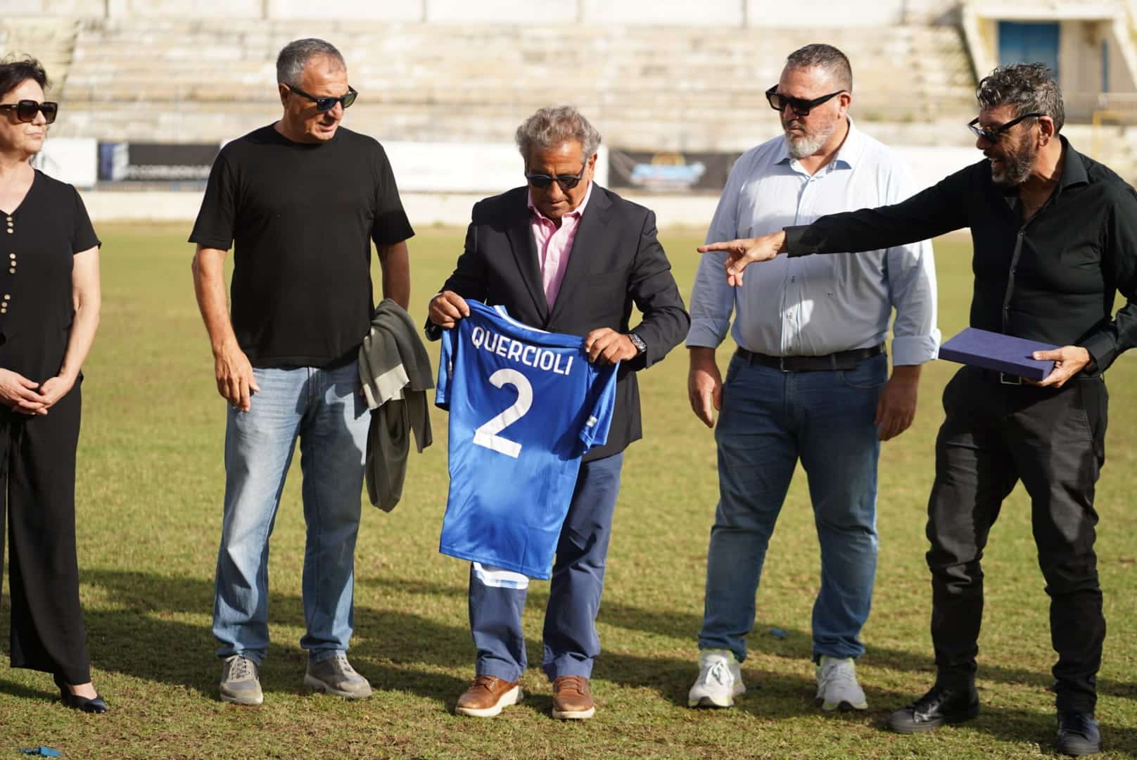 Sul terreno di gioco, accanto ai dirigenti biancazzurri — il presidente Salvatore La Porta e Salvatore Falzone, responsabile della parte economica del club — erano presenti la moglie Laura, le figlie Sara e Giulia e diversi ex compagni di squadra: Peppe Catalano, Gaetano Longo, Giovanni Oddo, Gerlando Piparo e Matteo Colucci, quest’ultimo promotore dell’iniziativa e legato a Quercioli da un profondo rapporto di amicizia e di militanza calcistica.