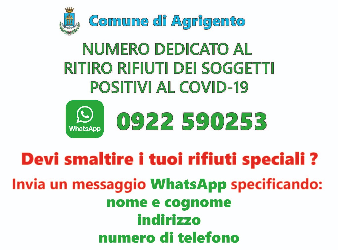 L’amministrazione di Agrigento ha attivato il servizio  whatsapp per la raccolta  e smaltimento rifiuti speciali sanitari prodotti da soggetti positivi al Covid-19. Chi deve smaltire i rifiuti speciali potrà scrivere al numero 0922590253 e indicare nome, cognome , indirizzo e numero di telefono.