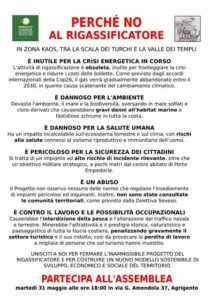 Il prossimo 31 maggio, alle 18 in via Amendola 37 ad Agrigento, i rappresentanti delle associazioni che si battono contro la realizzazione di un  rigassificatore a Porto Empedocle, si riuniranno in assemblea per ribadire, ancora una volta, perché dicono “NO” all’impianto. Secondo alcuni punti inseriti nella locandina,  il rigassificatore è “inutile per affrontare la crisi energetica in corso perchè l’attività di rigassificazione è obsoleta”, sarebbe pericoloso per la natura perchè “devasta l’ambiente e la biodiversità, sversando in mare solfati e cloro-derivati che causerebbero gravi danni all’habitat marino e fastidiose schiume in tutta la costa”, e sarebbe dannoso per la salute perché “ha un impatto incalcolabile sull’ecosistema terreste e sul clima con rischi alla salute connessi al sistema riproduttivo e immunitario dell’uomo”. “E’ un abuso perchè non osserva nessuna delle norme che regolano l’insediamento di impianti pericolosi ed inquinanti”; “E’ contro il lavoro e le possibilità occupazioni perchè causerebbe l’interdizione della pesca e l’alterazione del traffico navale e terrestre. Mirerebbe l’attrattività e il prestigio storico, naturalistico e paesaggistico di tutta la fascia costiera , penalizzando gravemente il settore turistico e il suo indotto”. Tra i sostenitori dell’assemblea  c’è il deputato nazionale, Michele Sodano: “I lavori più critici partiranno il 20 giugno prossimo alla camera – ci dice- dove si discuterà, in commissione bilancio, sul decreto aiuti che all’art. 5 prevede la nomina dei commissari dei rigassificatori per l’eventuale costruzione fregandosene delle valutazioni di impatto ambientale. Questo rigassificatore- ribadisce Sodano- non serve per riuscire a risolvere la crisi energetica attuale perchè sarà pronto tra sei  anni quando le direttive europee tutte sono orientate sullo spegnimento del  gas. Si verrebbe a costruire un’opera inutile , tutto dovrà  passare per le fonti  rinnovabili. Si andrebbe a costruire  un ecomostro  inutile con  danno per il territorio. Nel decreto tutti insieme stiamo preparando emendamenti per abrogare l’intero art. 5. Vogliamo rendere impossibile la costruzione di qualsiasi rigassificatore a pochi km da beni culturali e paesaggistici”.