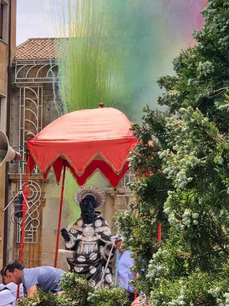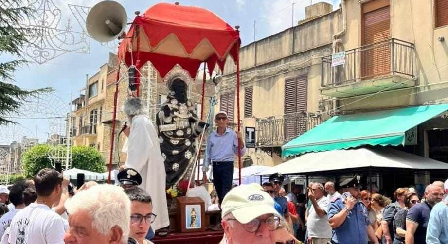Giornata clou oggi della festa di San Calogero a Naro portato in processione dal Santuario alla chiesa di San Francesco (la chiesa Madre è chiusa per restauro) con un carro, la straula, tirato dai fedeli, per mezzo di due corde lunghe ciascuna 100 metri. Ed è stato un bagno di folla. La mattinata era iniziata con la banda musicale in giro per le strade di Naro. E ieri sera a mezzanotte quasi l’intera comunità narese, e non solo hanno assistito allo spettacolo dei fuochi d’artificio. In questi due giorni l’afflusso di persone provenienti dai paesi vicini, da Agrigento, Canicattì, Campobello di Licata, Camastra e Palma di Montechiaro, è stato davvero impressionante. In tanti ne hanno approfittato per visitare la fiera di San Calogero con la presenza di numerose bancarelle.