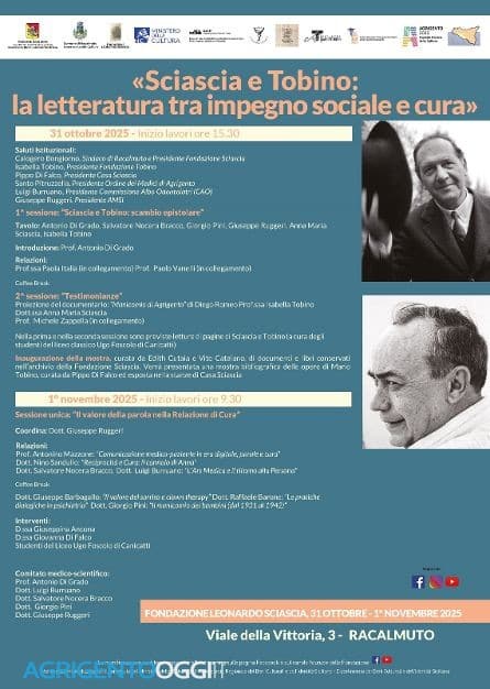 “Sciascia e Tobino: la letteratura tra impegno sociale e cura” è il titolo del convegno in programma venerdì e sabato prossimi, nella sede della Fondazione Leonardo Sciascia, in viale della Vittoria a Racalmuto. Un evento, promosso dall’Ordine dei medici chirurghi e odontoiatri (Omceo) di Agrigento e dalla Fondazione Leonardo Sciascia, che si avvale della collaborazione dell’Associazione Medici Scrittori Italiani (Amsi). Due giornate dedicate all’amicizia tra Mario Tobino e Leonardo Sciascia corredate dall’esposizione di un “corpus” epistolare messo insieme per la prima volta grazie alla disponibilità delle due Fondazioni – Sciascia e Tobino – e della Casa Museo Sciascia, presieduta da Pippo Di Falco, che hanno fornito il prezioso materiale per consentirne la fruizione al pubblico.