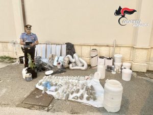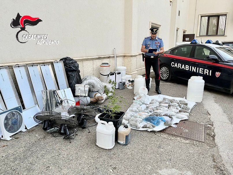 I militari nel corso della perquisizione presso l’abitazione della coppia, nel quartiere popolare del Villaggio dei Fiori di Licata, hanno rinvenuto una serra artificiale per la coltivazione di marijuana, completa di sistema idrico, umidificazione, illuminazione, fertilizzazione ed areazione; una pianta di marijuana in fase di inflorescenza; 6,5 kg. di marijuana, confezionata in 55 confezioni trasparenti in plastica pronti allo spaccio; 800 grammi di marijuana all’interno di un secchio bianco in plastica; 185 grammi di hashish all’interno di un involucro in cellophane, e vario materiale per il confezionamento, e la lavorazione della sostanza.