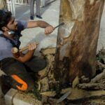 Scultori all’opera im via Esseneto: trasformano tronchi in opere d’arte