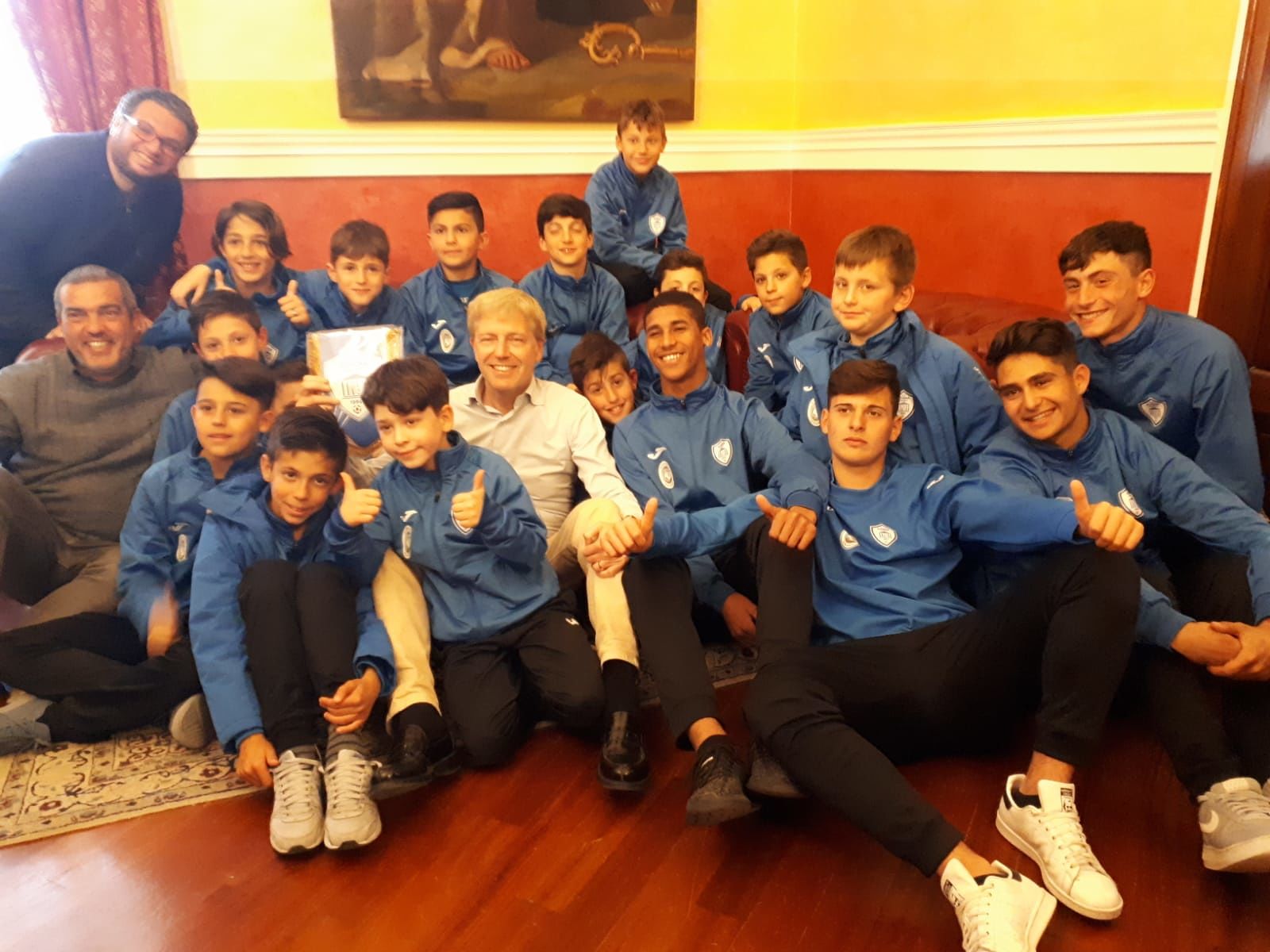 AGRIGENTO, 9 APRILE – Momento di grande orgoglio, oggi pomeriggio, per I piccoli campioni della scuola calcio Athena che sono stati ricevuti ufficialmente dal sindaco Lillo Firetto presso la sala di rappresentanza, al secondo piano del palazzo comunale di piazza Pirandello. Il primo cittadino di Agrigento ha voluto conoscere e salutare personalmente i “pulcini”, vincitori del torneo regionale, che prossimamente saranno a Forte dei Marmi per disputare il torneo nazionale in rappresentanza della Sicilia e i ragazzi della Omnia Phonix vincitori del torneo nazionale di calcio a 5 “Gatorade”. Questi ultimi, come ha spiegato al sindaco il mister Giovanni Sorce, sono in partenza per la Spagna dove disputeranno il torneo internazionale “Gatorade” in rappresentanza dell’Italia contro 23 rappresentative calcistiche di altrettante nazioni. Entrambe le squadre appartengono alla scuola calcio Athena. Al termine foto-ricordo con il sindaco e consegna del gagliardetto.