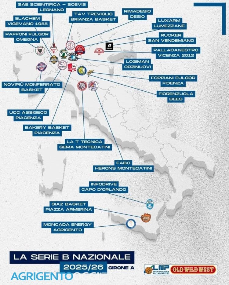 La Fortitudo Moncada Agrigento conosce finalmente il proprio destino: sarà inserita nel Girone A della Serie B Nazionale 2025/26. Un raggruppamento a 19 squadre che toccherà ben cinque regioni – Sicilia, Lombardia, Emilia Romagna, Piemonte e Toscana – con trasferte lunghe e un calendario asincrono, che prevede un turno di riposo settimanale per ciascuna squadra.