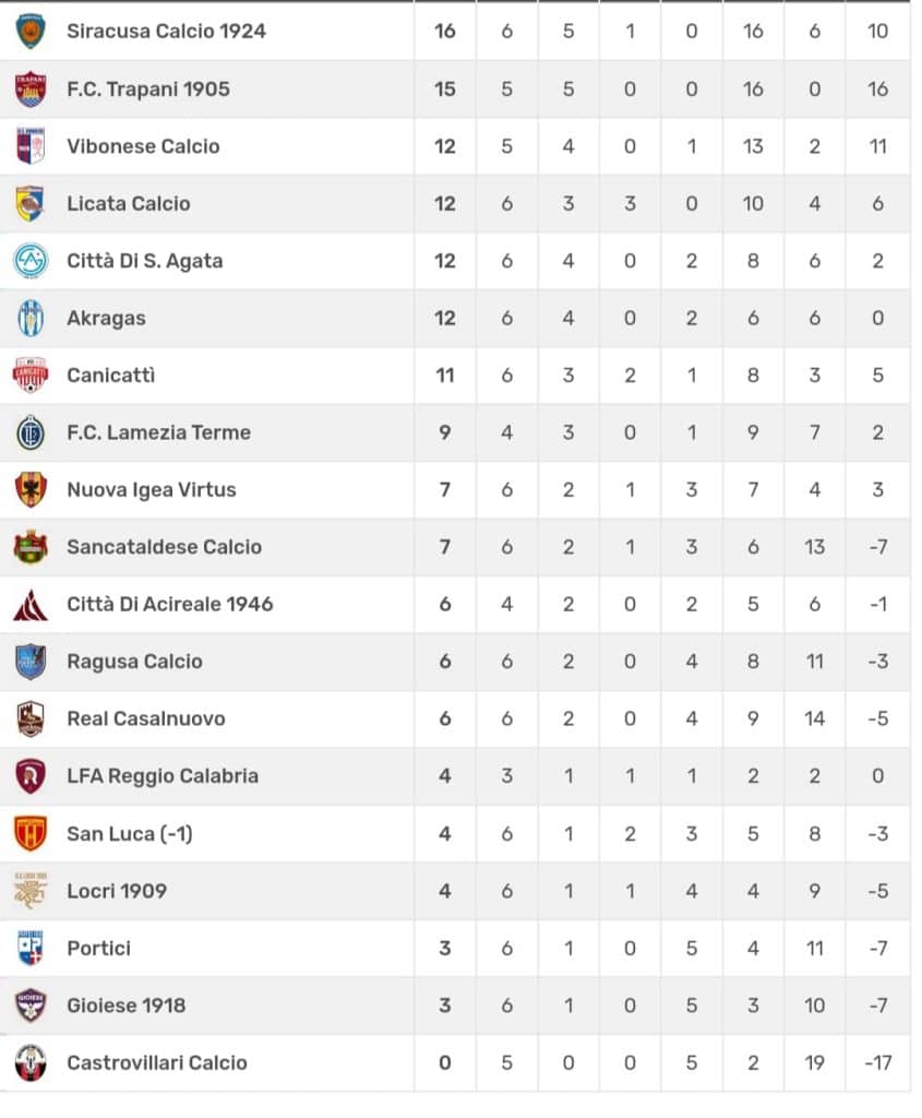 Dopo il completamento della sesta giornata del Girone I della Serie D, il Siracusa rimane saldo in vetta alla classifica con 16 punti, nonostante abbia osservato il turno di riposo. Il Trapani è inseguitore immediato con 15 punti, mentre Vibonese, Akragas, Licata e Sant’Agata seguono da vicino a quota 12 punti. Nel frattempo, il Lamezia ha raggiunto quota 9 punti, ma deve recuperare la partita contro la Reggina, avendo anch’esso osservato il turno di riposo.