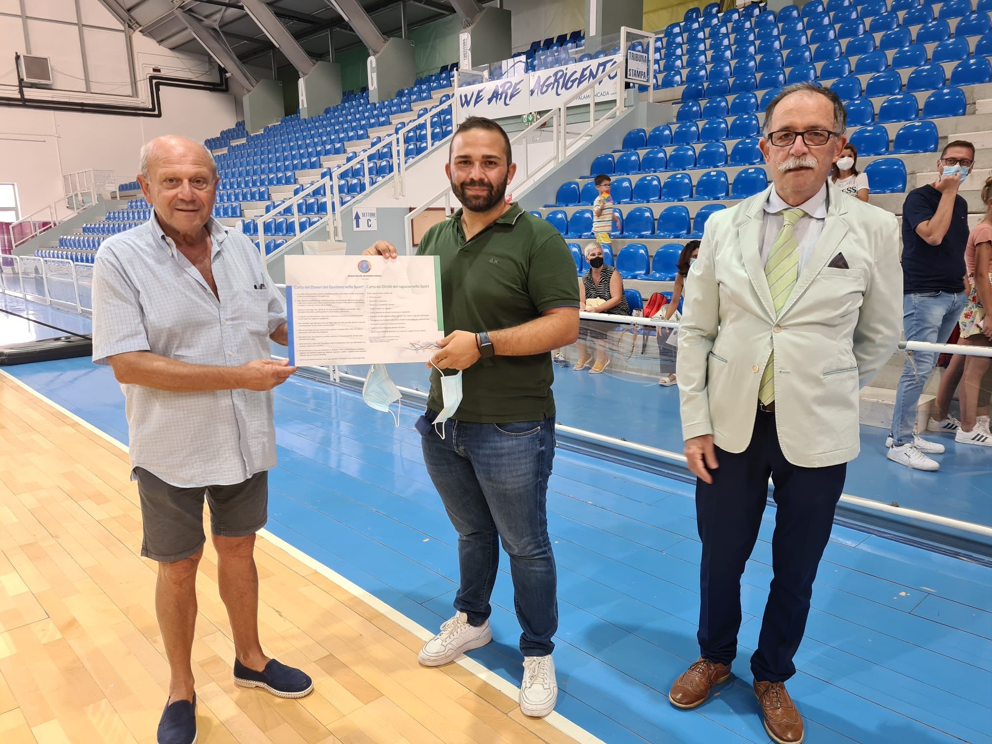 Il Panathlon club di Agrigento ha celebrato giovedì pomeriggio, 23 settembre, al Palamoncada di Porto Empedocle la Settimana Europea dello Sport. E’ stato scelto un luogo simbolo dello sport dove diverse decine di genitori accompagnano periodicamente i loro figli a imparare a giocare a basket e ad emulare quelli più grandi che, nello stesso parquet, hanno vinto e vincono ancora partite ecampionati. Per questo è stato ritenuto il luogo ideale per fare conoscere la Carta dei diritti del ragazzo nello sport, fatta leggere da un ragazzino e la Carta dei doveri del genitore nello sport è stata letta da un genitore. Ai presenti sono stati distribuiti dei volantini riportanti entrambe le carte. la Carta del Fair play è stataletta dall’allenatore dei ragazzi La Targa Etica che riporta i diritti dei ragazzi e quella dei doveri dei genitori è stata consegnata al presidente della Fortitudo, dott. Gabriele Moncada. Alla fine ai bambini sono state consegnate magliette e spille del Panathlon.