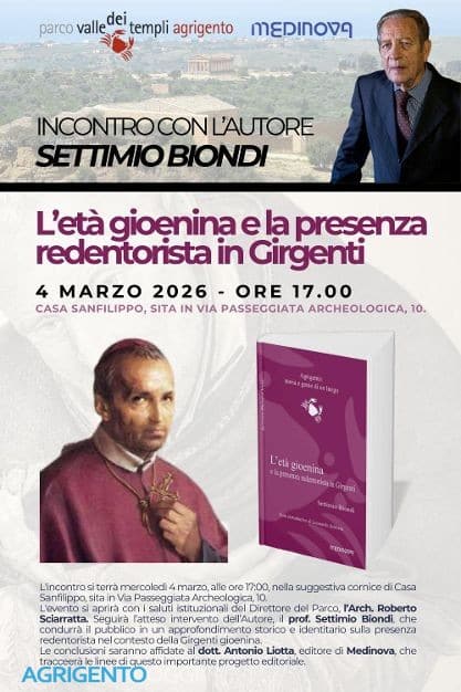 Mercoledì 4 marzo, alle ore 17, nella prestigiosa cornice di Casa Sanfilippo, ad Agrigento, si terrà la presentazione ufficiale del libro di Settimio Biondi “L’età gioenina e la presenza redentorista in Girgenti”, riedizione di un testo originariamente pubblicato negli anni ’80, oggi restituito ai lettori in una nuova veste editoriale e accompagnato da un elemento di straordinario valore: la prefazione di Leonardo Sciascia, che ne sottolinea la rilevanza culturale e letteraria. L’opera rinasce oggi grazie al significativo contributo del Parco Archeologico e Paesaggistico della Valle dei Templi, che ha sostenuto la pubblicazione attraverso il proprio patrocinio, e a un importante lavoro editoriale della Medinova, inserendola all’interno di una specifica collana dedicata alla valorizzazione e alla sistematica riproposizione di tutte le opere, edite e inedite, di Settimio Biondi.