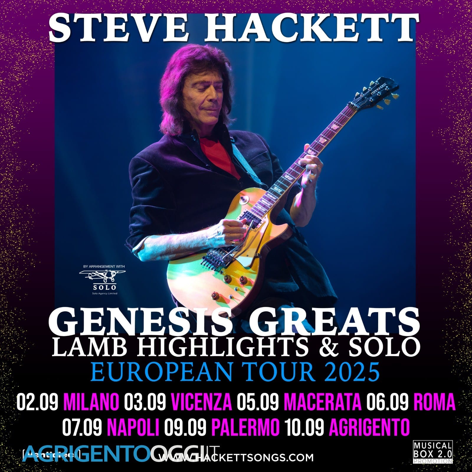 AGRIGENTO – Dopo il clamoroso successo del tour mondiale 2024, Steve Hackett, il leggendario chitarrista dei Genesis, si prepara a incantare il pubblico siciliano con una data imperdibile: 10 settembre al Palacongressi di Agrigento.