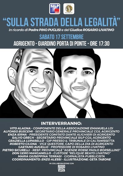 Si terrà sabato 17 settembre, alle 17:30, nel giardino Porta di Ponte di Agrigento, l’evento commemorativo “Sulla strada della legalità” in ricordo di Padre Pino Puglisi e del Giudice Rosario Livatino, assassinati dalla mafia. Due uomini dai grandissimi valori etici, accomunati dalla fede viva, uniti anche dal barbaro assassinio che ha finito con il trasformare la loro morte in un atto di vita, ponendosi come significativi esempi di estremo sacrificio in difesa della legalità e della cultura antimafiosa. L’evento è organizzato dall’Associazione Emanuela Loi di Agrigento e dal Silp Cigl di Agrigento.