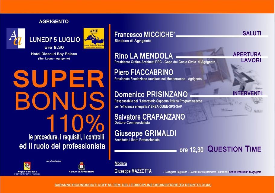 Dopo i saluti del Sindaco Franco Micciché, i lavori saranno aperti da Rino La Mendola, presidente dell’Ordine, e da Pietro Fiaccabrino, presidente della Fondazione Architetti nel Mediterraneo e proseguiranno con gli interventi di Domenico Prisinzano, ingegnere e responsabile del dipartimento Unità – Efficienza Energetica dell’Enea; Salvatore Crapanzano, commercialista, esperto per gli aspetti fiscali; Giuseppe Grimaldi, architetto ed esperto per gli aspetti tecnici.