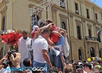 Durante la processione di San Calogero, un momento emozionante diventato tradizione annuale: portatori sollevano Jessica, affetta da disabilità, per avvicinarla ...