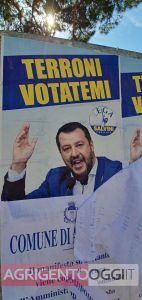 Finti manifesti elettorali con i volti di Matteo Salvini sono comparsi anche ad Agrigento in alcune bacheche destinate alla campagna elettorale per le Europee. “Terroni votatemi” si legge in alcuni dei manifesti con il volto di Salvini. Mentre in altre città d’Italia, come Bologna, apparsi oltre a questi manifesti con scritto “Più armi nelle scuole” , mentre Di Maio è ritratto accanto alla frase “Onesti quando ci pare”. I fotomontaggi, riportano in basso la firma #castigat. Ad Agrigento i manifesti sono stati coperti questa mattina con quelli del Comune di Agrigento. Sulla vicenda indaga a digos.