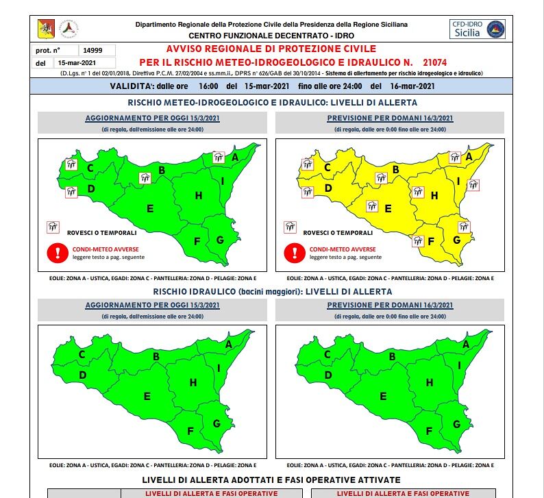 Dopo giorni di sole e temperature piacevoli arriva il maltempo nell’agrigentino. Il Dipartimento Regionale della Protezione Civile ha diramato il rischio meteo-idrogeologico e idraulico fino alle 24 di domani, 16 marzo. In particolare, il livello di allerta è “Verde” con fase operativa “Generica vigilanza” con rovesci e temporali, fini alla mezzanotte di oggi e livello di allerta “ GIALLA” fase operativa “ATTENZIONE” con rovesci o temporali fini alla mezzanotte di domani.