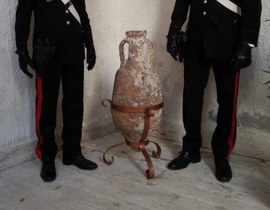 I carabinieri del reparto tutela e ambiente, nel corso di un blitz effettuato in un’abitazione, hanno ritrovato e sequestrato un’antica anfora risalente all’epoca romana.