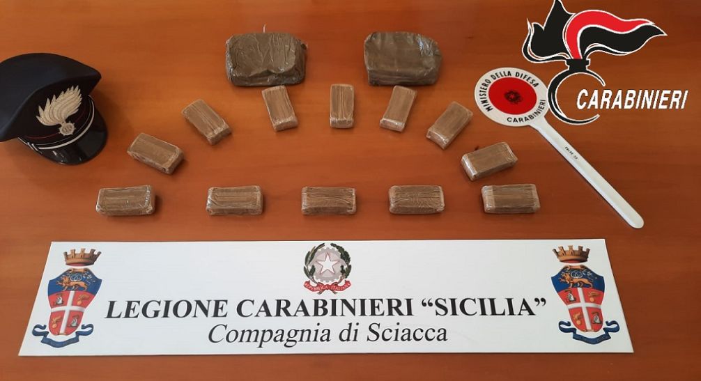 Trovato in possesso di 12 panetti di hashish da 100 grammi ciascuno. I Carabinieri della Compagnia di Sciacca hanno arrestato in flagranza di reato per detenzione di stupefacenti ai fini di spaccio, il 49enne palermitano Ignazio Lo Cascio. L’arresto durante un servizio di ordinario controllo della circolazione stradale. I militari hanno intimato l’Alt al conducente di una Fiat Panda che viaggiava sulla statale 115 da Menfi in direzione Sciacca.
