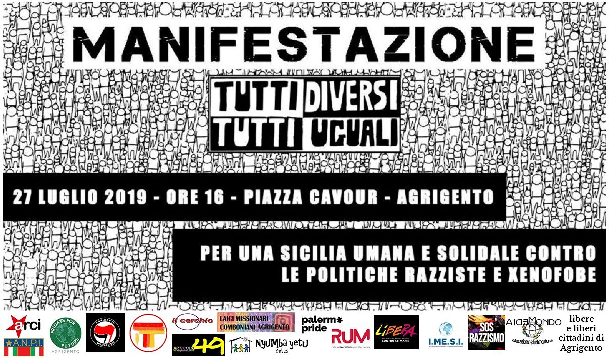 AGRIGENTO. Il prossimo 27 luglio ad Agrigento è prevista una manifestazione organizzata a sostegno delle azioni di soccorso in marre delle ONG e degli atti di resistenza civile operati dalle attiviste e attivisti, contro il clima di paura nei confronti dello straniero e delle diversità, contro le attuali politiche di gestione del fenomeno migratorio e in difesa dei diritti umani e dei principi democratici garantiti dalla Costituzione.
