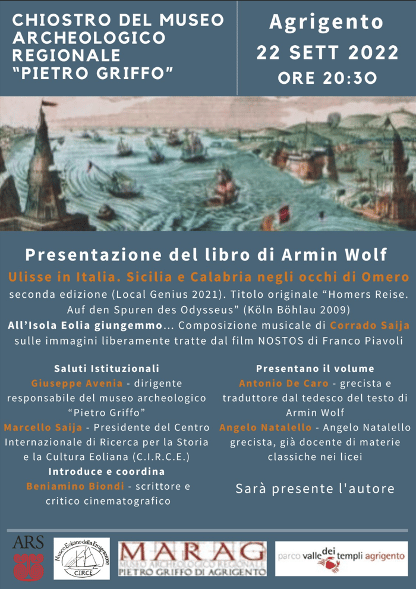 Ultimo appuntamento con il ciclo delle “Serate al Museo”, a cura di Beniamino Biondi, nel Chiostro del Museo Archeologico Pietro Griffo di Agrigento, giovedì 22 settembre alle 20:30. Un evento, sotto il profilo culturale, dall’interesse straordinario, e non a caso si è voluto proprio concludere con la presentazione del libro di Armin Wolf intitolato “Ulisse in Italia. Sicilia e Calabria negli occhi di Omero“. Un’edizione totalmente riveduta, corretta e di molto aggiornata. Fondamentali nuove ricerche compiute dall’Autore, riguardanti anche la cosiddetta “Questione Omerica”, offriranno straordinari strumenti di riflessione e approfondimento agli studiosi e agli appassionati di tutto il mondo. La straordinaria ricerca portata avanti dal professor Armin Wolf, durata circa quarant’anni ed effettuata in tutto il Mediterraneo centro-occidentale, rivoluziona l’approccio all’Odissea considerandola un vero e proprio testo di storia elaborato in versi piuttosto che una “semplice”, per quanto sublime, opera poetica. E quindi, grazie ad una serie di geniali intuizioni, confortate da ricerche approfondite e dall’analisi di innumerevoli fonti, l’Odissea di Omero, concepita nell’VIII secolo avanti Cristo, diventa il primo documento storico, frutto di un viaggio reale e puntualmente raccontato, che pone al centro del suo interesse la Calabria, la Sicilia, lo Stretto di Messina, l’Istmo di Catanzaro, le attuali Isole Eolie (che l’Autore preferisce denominare Lipari), Malta, il Mediterraneo centrale e occidentale. Dopo la proiezione di “All’Isola Eolia giungemm…”, una composizione acusmatica di Corrado Saija sulle immagini liberamente tratte dal film NOSTOS di Franco Piavoli, e i saluti di Giuseppe Avenia, dirigente responsabile del museo archeologico “Pietro Griffo”, e di Marcello Saija, Presidente del Centro Internazionale di Ricerca per la Storia e la Cultura Eoliana (C.I.R.C.E.), a presentare il volume saranno Antonio De Caro, grecista e traduttore dal tedesco del testo di Wolf, e Francesco Natalello, grecista già docente di materie classiche nei licei. Sarà presente l’Autore Armin Wolf. L’introduzione e il coordinamento della serata sono affidati a Beniamino Biondi.