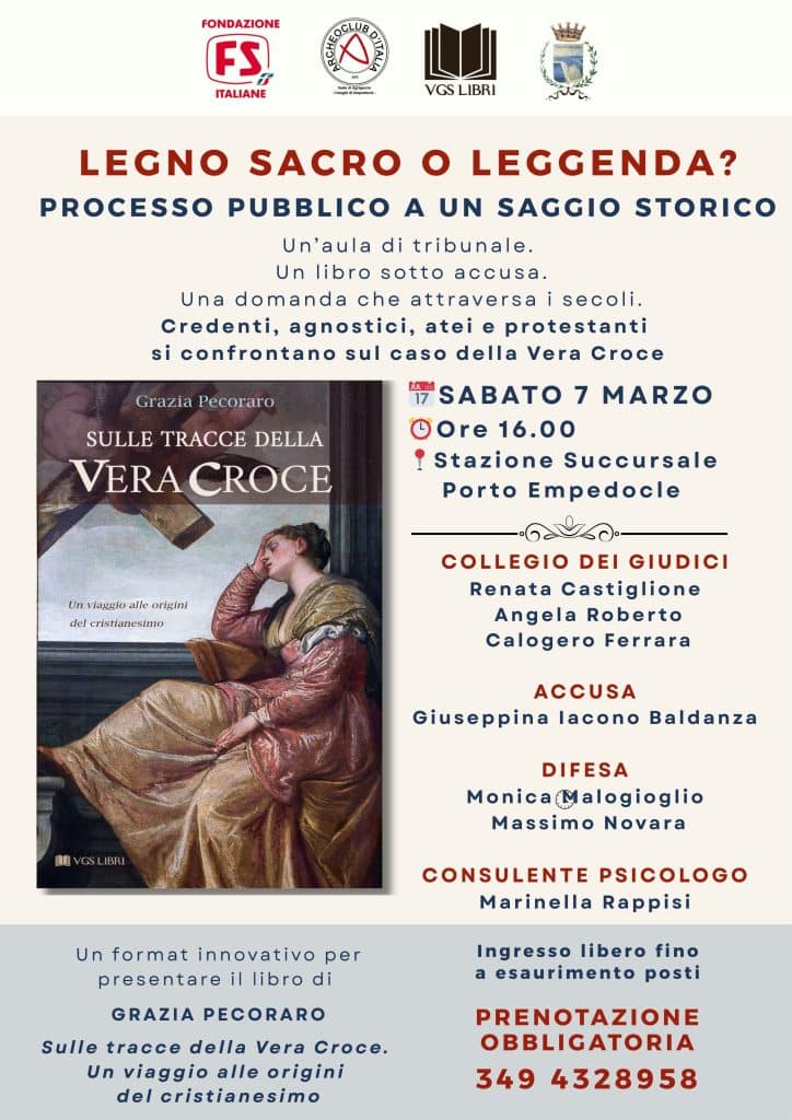 Sabato 7 marzo alle ore 16, presso la Stazione Succursale di Porto Empedocle, la presentazione del saggio Sulle tracce della Vera Croce. Un viaggio alle origini del cristianesimo di Grazia Pecoraro assumerà la forma di un vero e proprio dibattimento processuale.