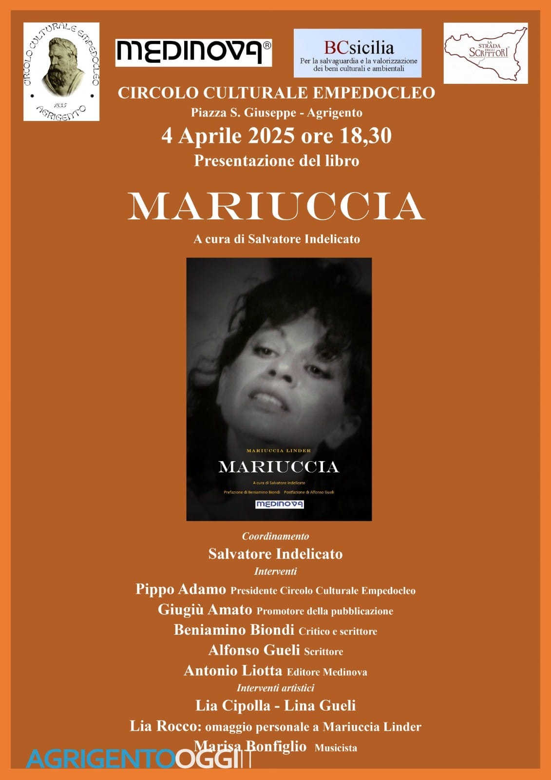 La presentazione di Mariuccia sarà arricchita dalla presenza di importanti personalità del mondo della cultura, come Pippo Adamo, presidente del Circolo Culturale Empedocleo, Giugì Amato, promotore della pubblicazione, e Beniamino Biondi, critico e scrittore. La serata vedrà anche l’intervento di artisti che renderanno omaggio alla sua memoria, come Lia Cipolla, Lina Gueli e Marisa Bonfiglio, con una performance che toccherà le corde più intime del pubblico. Sarà un’occasione imperdibile per celebrare non solo la figura di Mariuccia, ma anche quella di Agrigento, che da Via Neve, il cuore pulsante delle attività artistiche, si fa portatrice di cultura e bellezza.